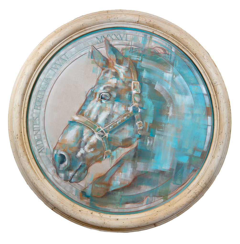 In Fortune Favors the Bold (2026), Sean Rush presents a commanding equine portrait woven with atmosphere and symbolism. The circular format gives the piece a talismanic presence: the horse is at once emblem and living creature, encircled yet transcendent. Fortune Favors the Bold stands as a fusion of classical reverence and modern abstraction—a visual reminder that audacity, grace, and vision may unite in one bold form.