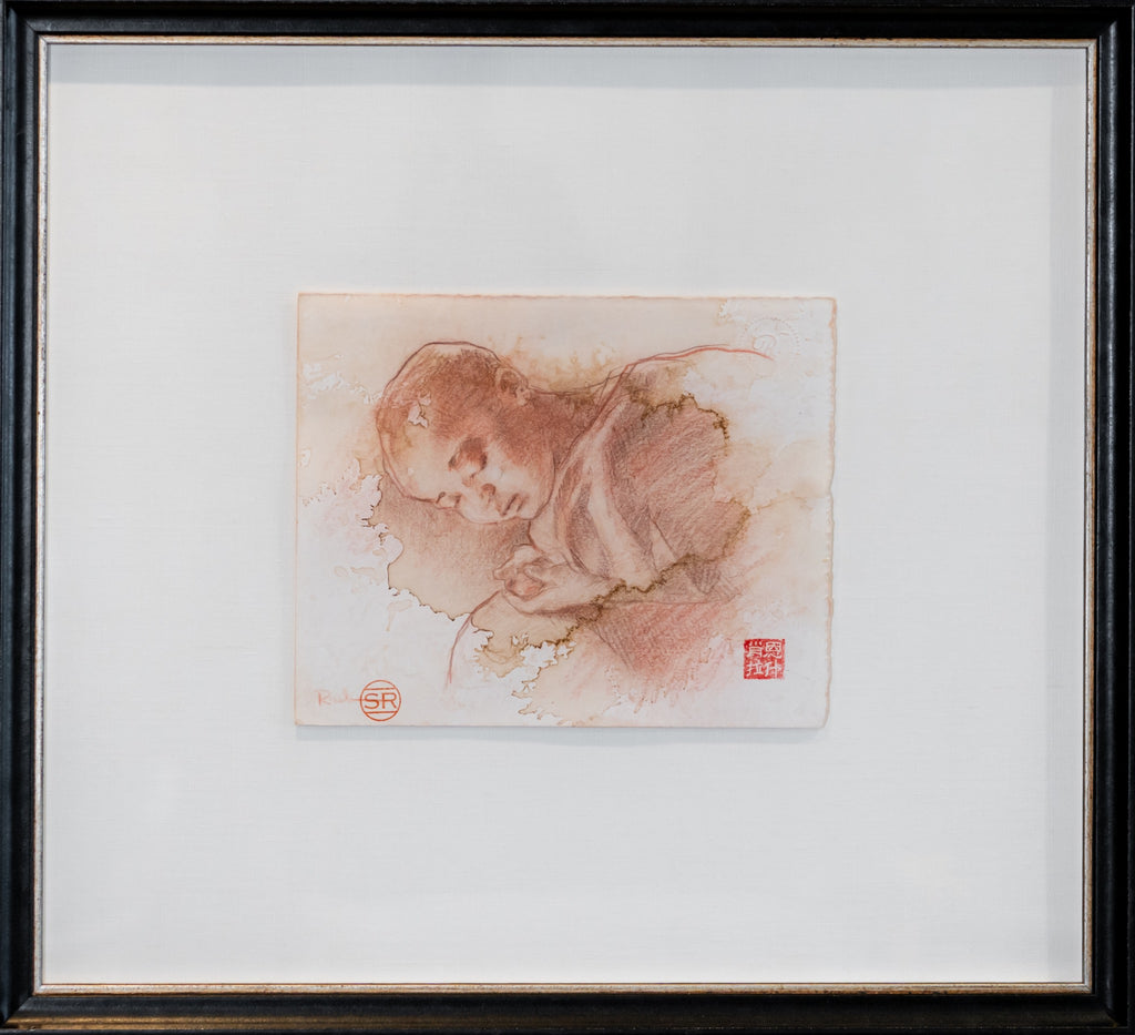 Sean Rush presents Monk’s Prayer as a conte-pencil portrait capturing a moment of childlike devotion and spiritual stillness. Rendered in precise conte lines, the drawing frames a young monk with bowed head and clasped hands, evoking a silent ritual of prayer. Warm sepia tones suggest quiet presence and innocence.