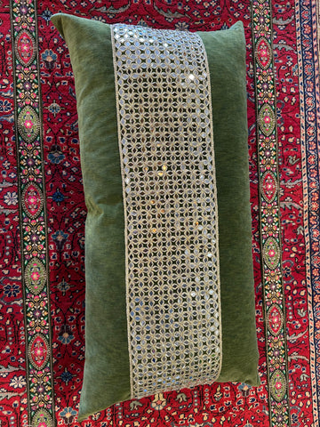 Indulge in luxury with this handmade Olive Green Velvet Pillow, crafted to perfection for a truly opulent touch. Adorned with exquisite Vintage Indian Mirrored Tape, the pillow boasts intricate detailing that adds depth and allure. With its grand 3' x 2' size, it commands attention and brings a sense of sophistication and elegance to any space. Designed by Sean Rush.