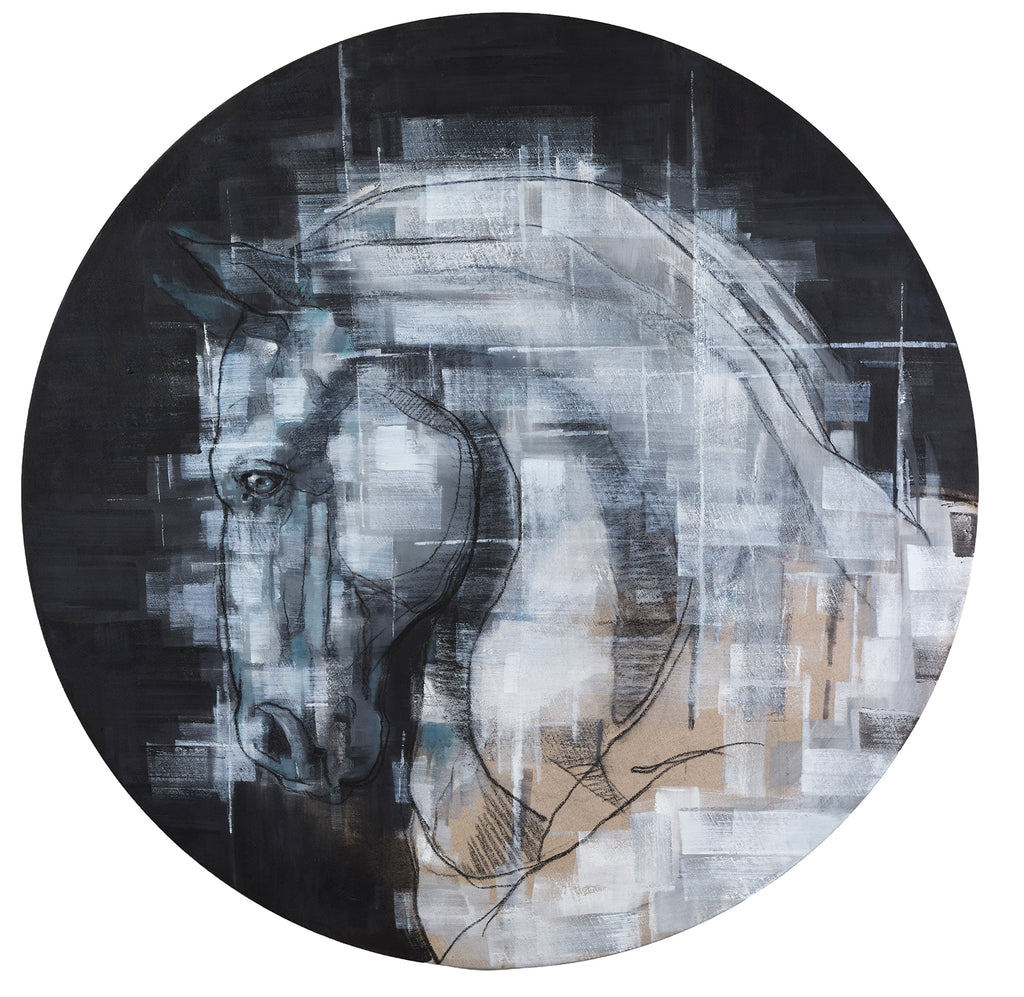 Raven Oculus was from Sean Rush’s 2026 Oculus collection. These 48" round beligan linen medallions are noble studies in the round format. Painted in exploded brushstrokes in oil with a contour line in charcoal.